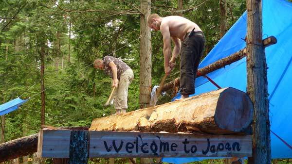 To finish some video of them in action along with one of the Japanese carpenters who came to have a play with some European hewing axes and helped Jochen to finish surface one of the beams.