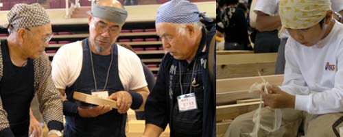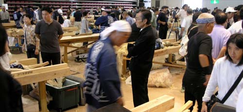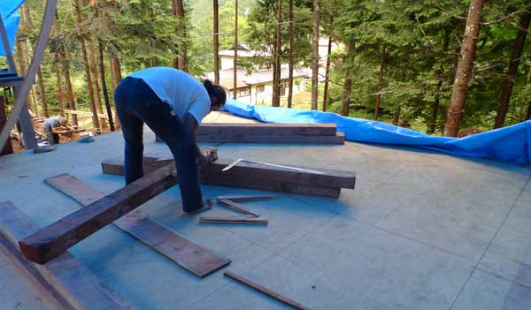 Then the roof is built, starting with three cross-beams that tie the side panels in place. The Japanese are meticulous about keeping the site tidy and in the foreground of this picture you can see one of the carpenters with a lovely wooden rake used for clearing away the wood shavings: