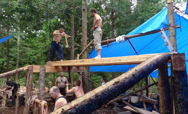 The side panels had been made in advance; hand sawn planks nailed to cross-laths using beautiful nails made by the Japanese blacksmith, and they were slotted into rebates cut into the uprights as the main body of the tea house was put together. Here you can see the first upright frame in place and the first side panels being slotted in (In the model the wall closest to the camera has been left out so you can see inside!)