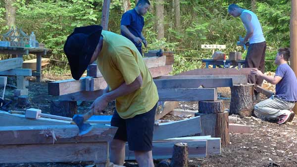 It was made in a similar way to the European building; each piece is cut to shape and each joint is tested individually before it is all finally put together, so the final construction happens amazingly quickly. Here's how it happened with a little additional explanation from the scale model that they used to guide their work. Firstly the base frame was constructed and the rear half boarded out: