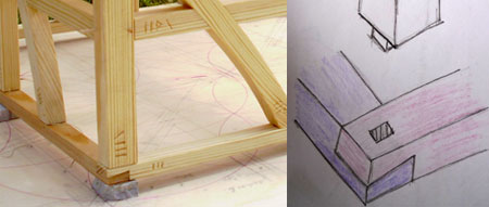 The side panels had been made in advance; hand sawn planks nailed to cross-laths using beautiful nails made by the Japanese blacksmith, and they were slotted into rebates cut into the uprights as the main body of the tea house was put together. Here you can see the first upright frame in place and the first side panels being slotted in (In the model the wall closest to the camera has been left out so you can see inside!)