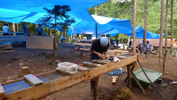 Then the roof is built, starting with three cross-beams that tie the side panels in place. The Japanese are meticulous about keeping the site tidy and in the foreground of this picture you can see one of the carpenters with a lovely wooden rake used for clearing away the wood shavings: