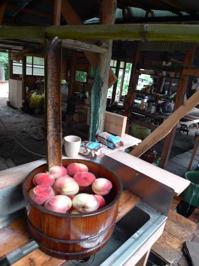 It has an open area at the front with a hearth and kettle (the Japanese blacksmith made the hook for this and it is very beautiful), and a raised area at the back with tatami mats which were also made on-site and I will post more about them in the future. There is tracking for sliding doors front and back and I guess these will be added later along with the roof, which I think will be made of wooden shingles.