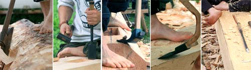 Joint numbers: Every joint is labelled with a series of symbols and you can see these too in the picture below of Hannes working on our little barn. If you can read them, the symbols will show exactly where in the barn each end of every timber goes. Buildings like this are not built gradually, instead all the pieces are cut and every joint tried and tested in isolation before finally the frame is constructed in one go. I think there are various different regional systems of doing this in Europe, and the Japanese one is different again, so it will be interesting to find out how they have chosen to do it!